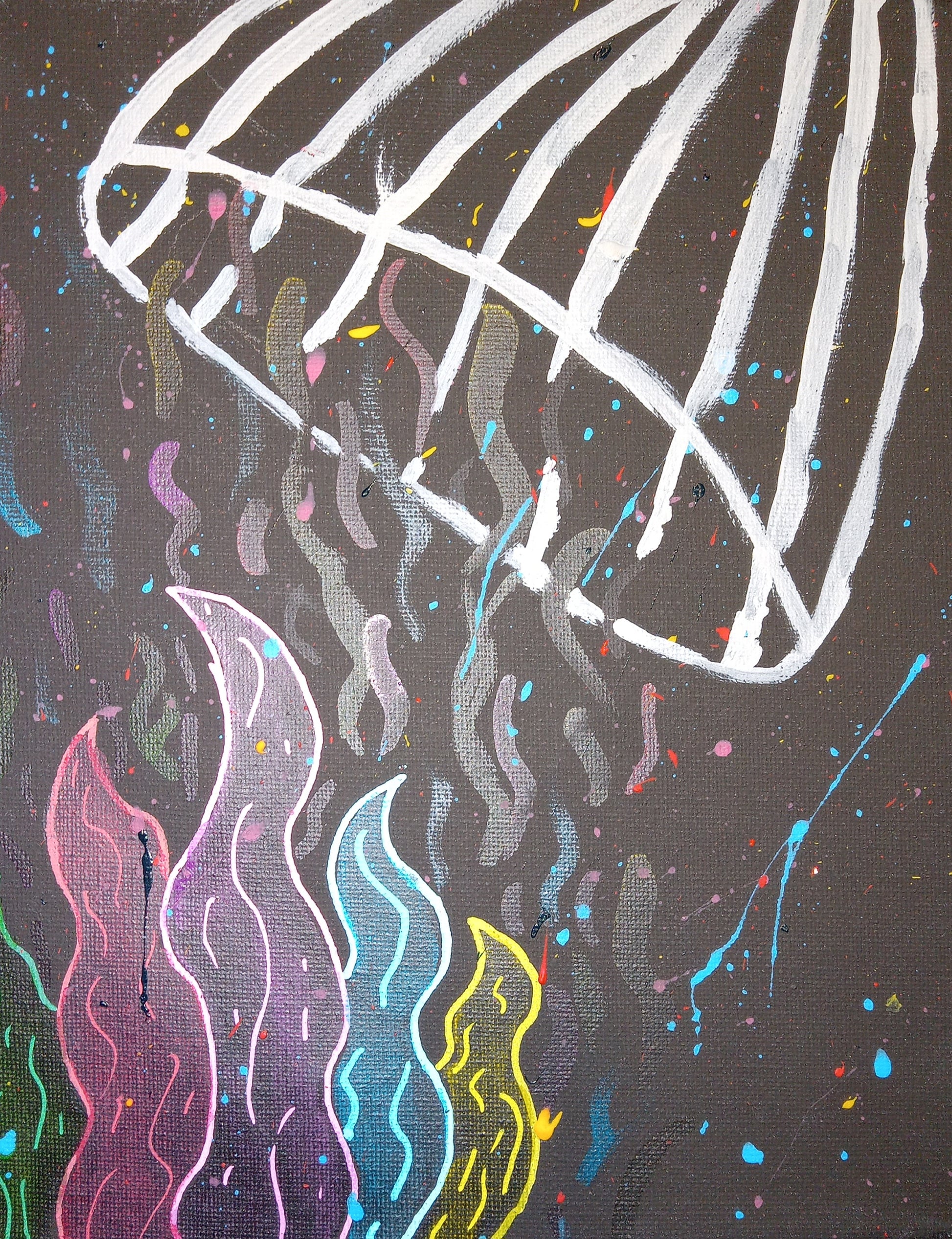 The painting depicts a more literal view of the phrase "Catching Feelings." In this painting, the flames represent feelings and the cage in someone catching them. Watercolor paint was used for the interior of the flames and acrylic was used for the cage and outline of the flames.