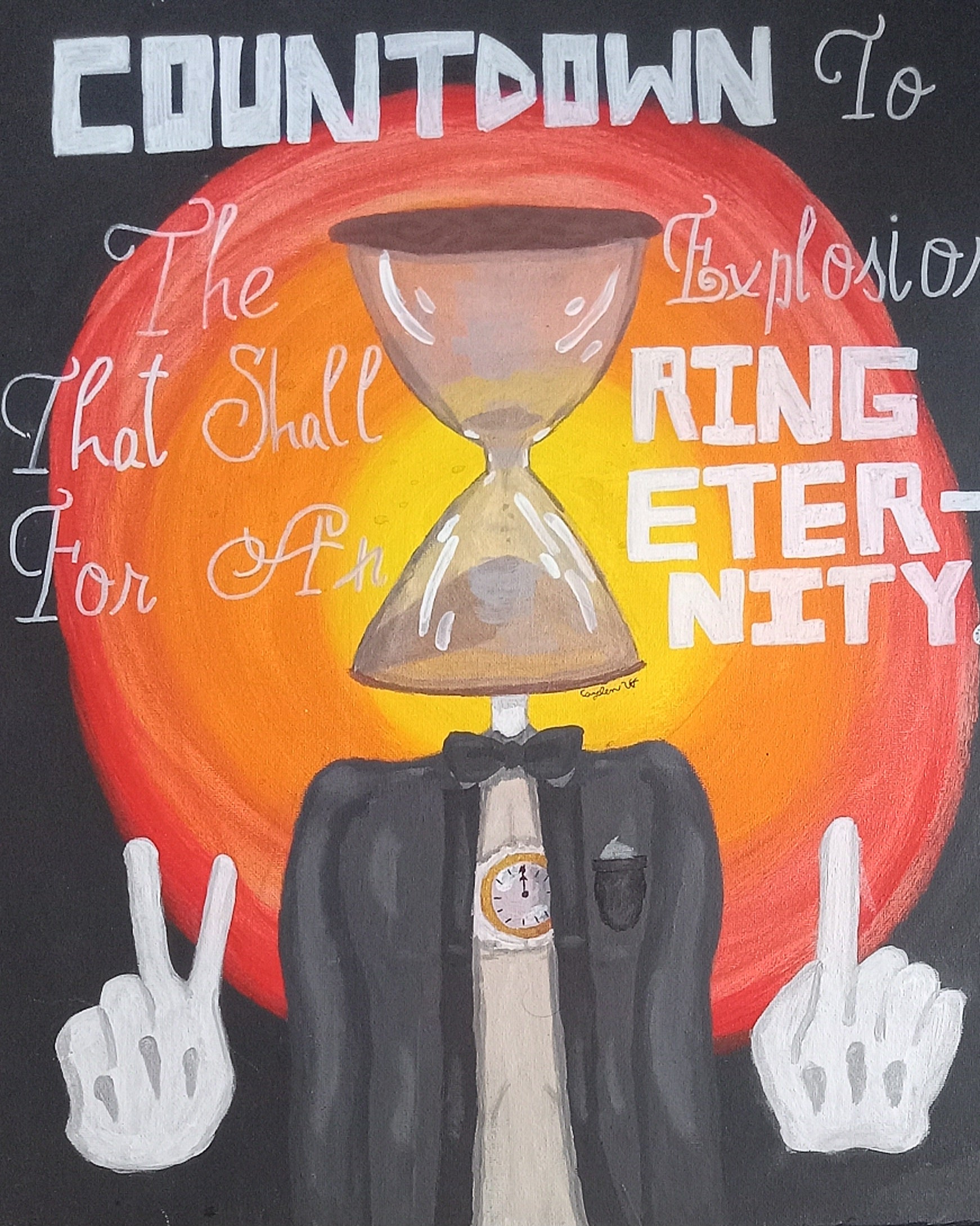 This painting depicting a man with an hourglass as a head is Part of Caylen Faith's Court of Demon painting series. This installment represents Caylen Faith's feelings of impending doom and paranoia. This is highlighted through the almost empty hourglass, showing time is almost running out, as well as the character's fingers, which are counting down, but not yet at zero, showing whatever is feared is yet to come. The painting also features the words "Countdown to the explosion that shall ring for an Eternity." Emphasising the words "Countdown", "Ring", and "Eternity". These words again highlight a feeling of impending doom with this explosion being a metaphor for the fictional danger the artist sometimes perceives. the background also helps to convey this idea of an explosion that is oncomming with the bright explosive colors that have not yet overtaken the background.
