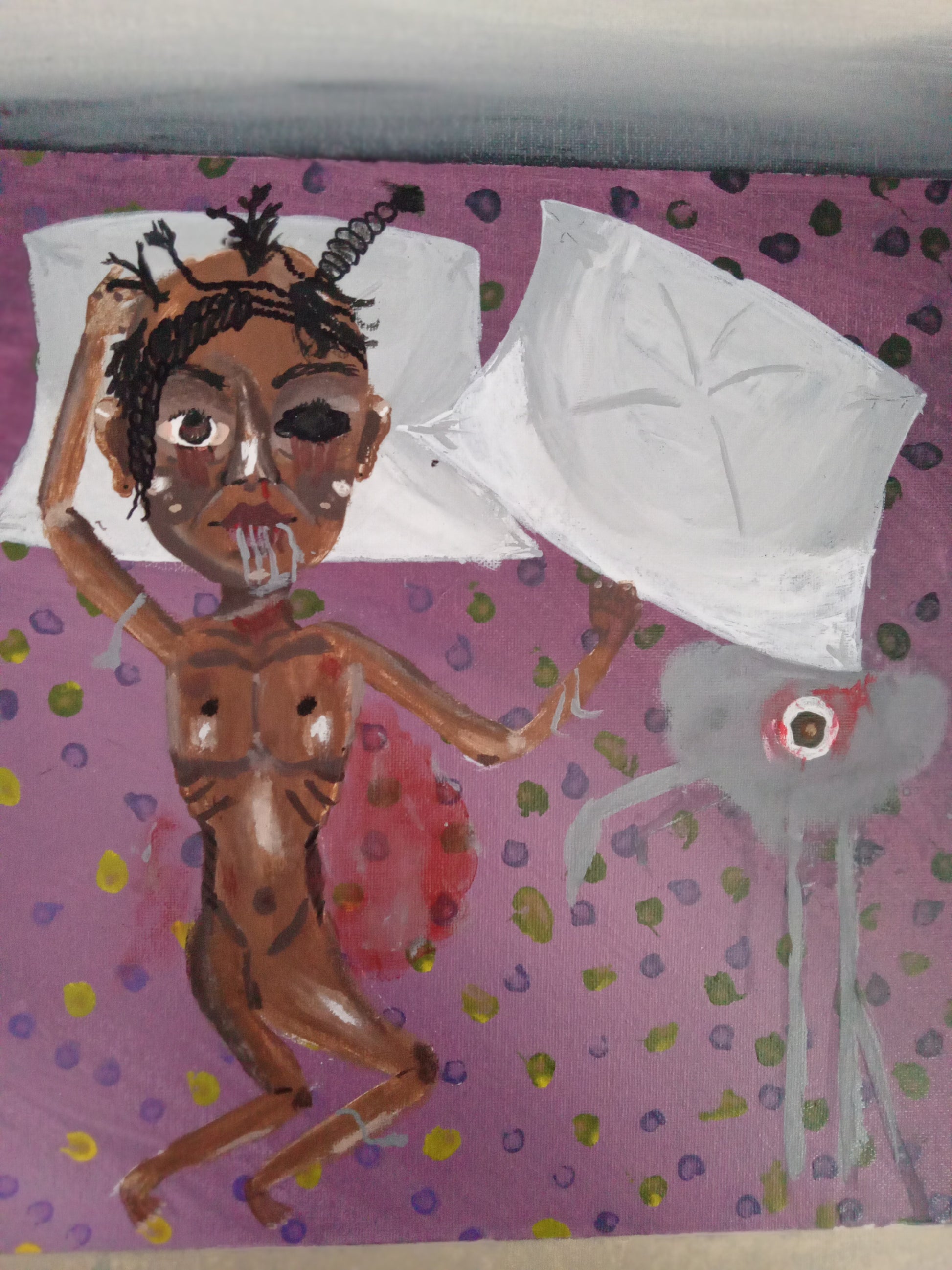The painting depicts a nightmare the artist had as a child in which a grey spot on her bed led to her death. To show that the grey spot is responsible for the girl in the painting's death Caylen Faith uses streaks of grey in areas where there is blood. Though this painting is quite disturbing it shows lovely craftsmanship with each tiny detail in the painting.