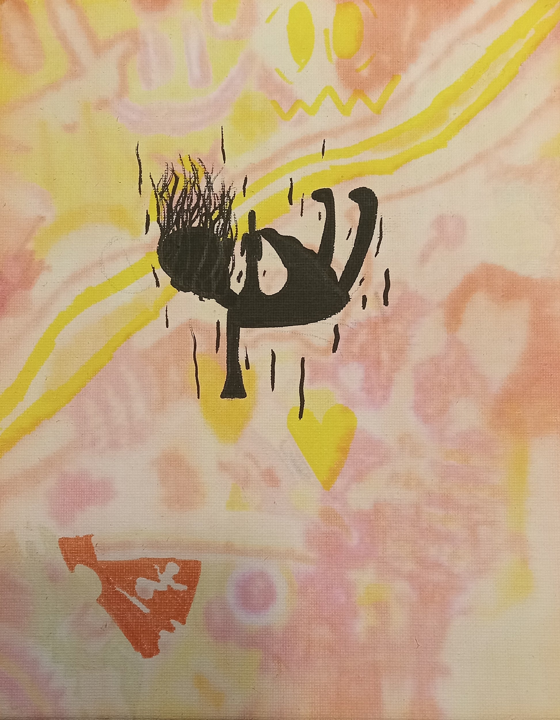 The painting uses markers and alcohol to create the background. This painting conveys the feeling of falling into your own rage and letting it consume you.