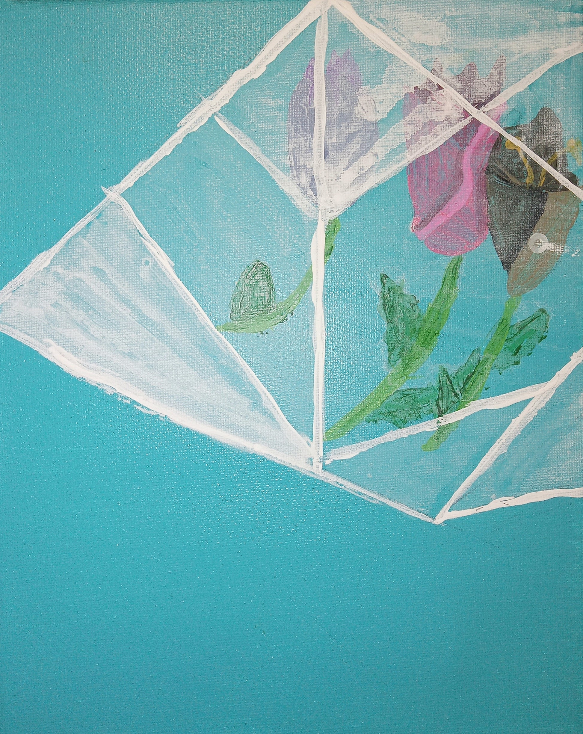 The painting depicts flowers trapped in a prism conveying the message of beauty is often trapping.