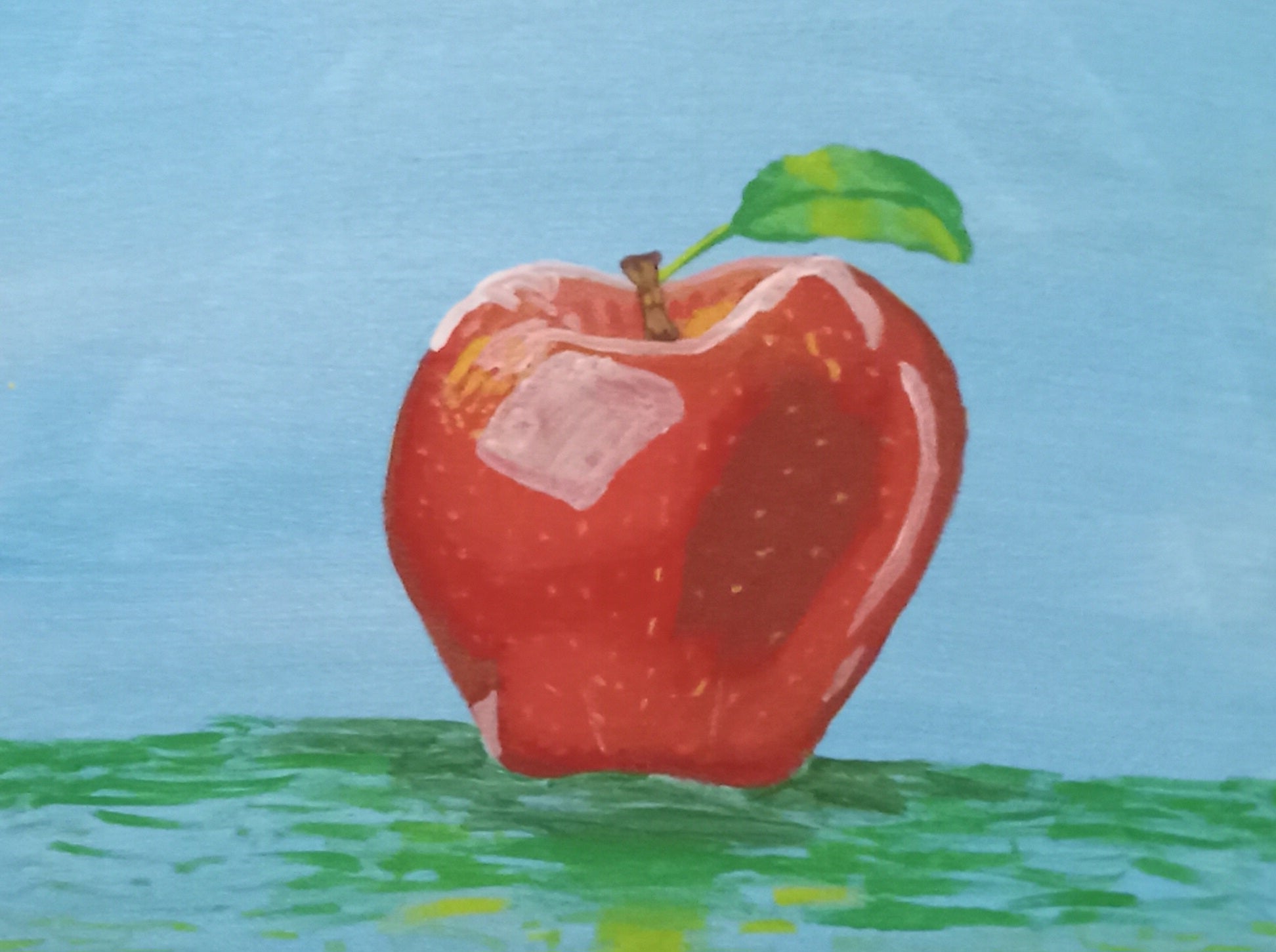 This painting of a beautiful apple would look gorgeous in any space, capturing the beauty of the simple fruit against the painting's blue background, which contrasts with the apple's red hue.