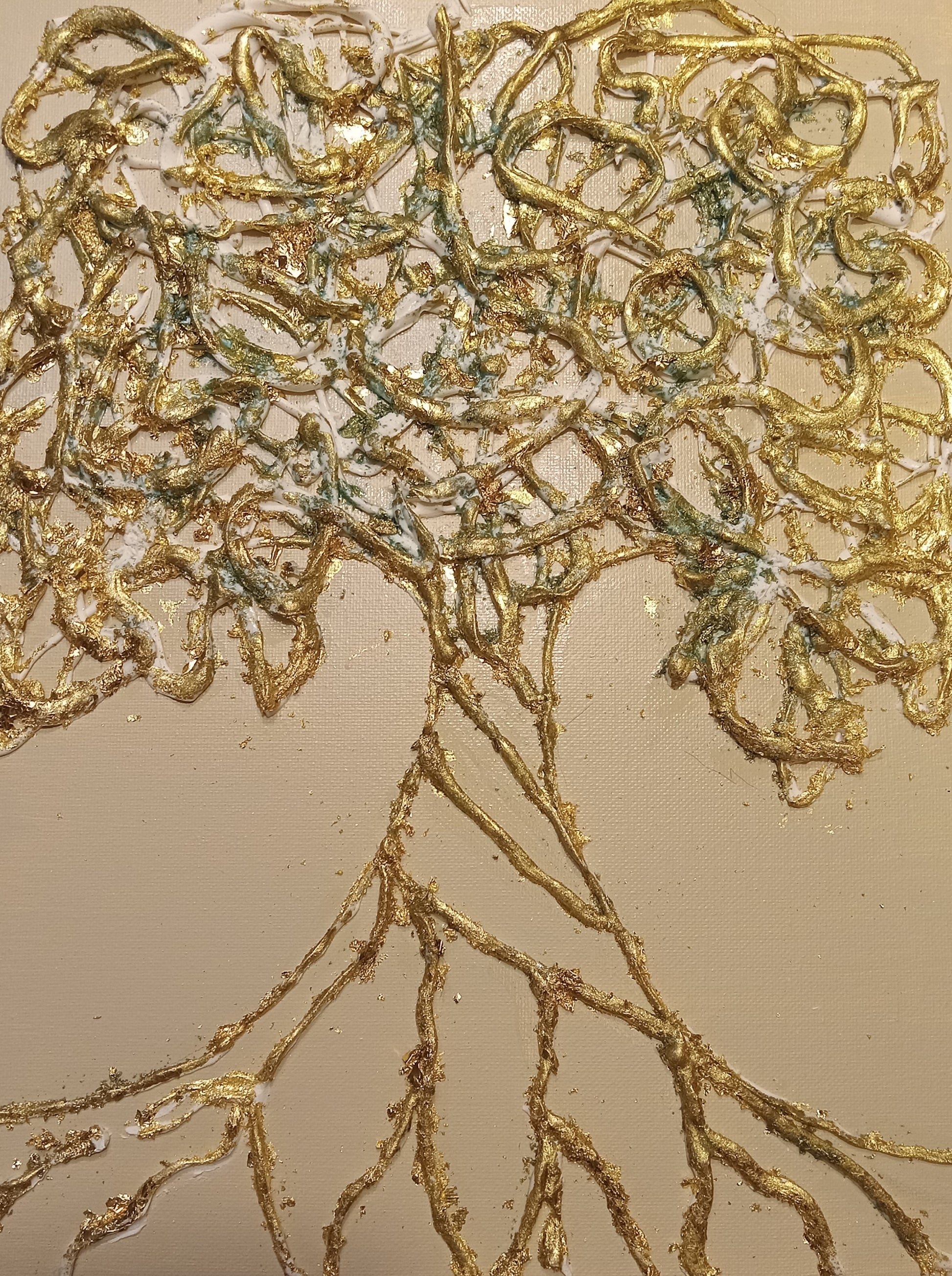 This painting uses spackling to create a tree and gold leaf to turn the tree gold. The painting demonstrates a message on wealth and good fortune and how like a tree it can grow big, but also die.