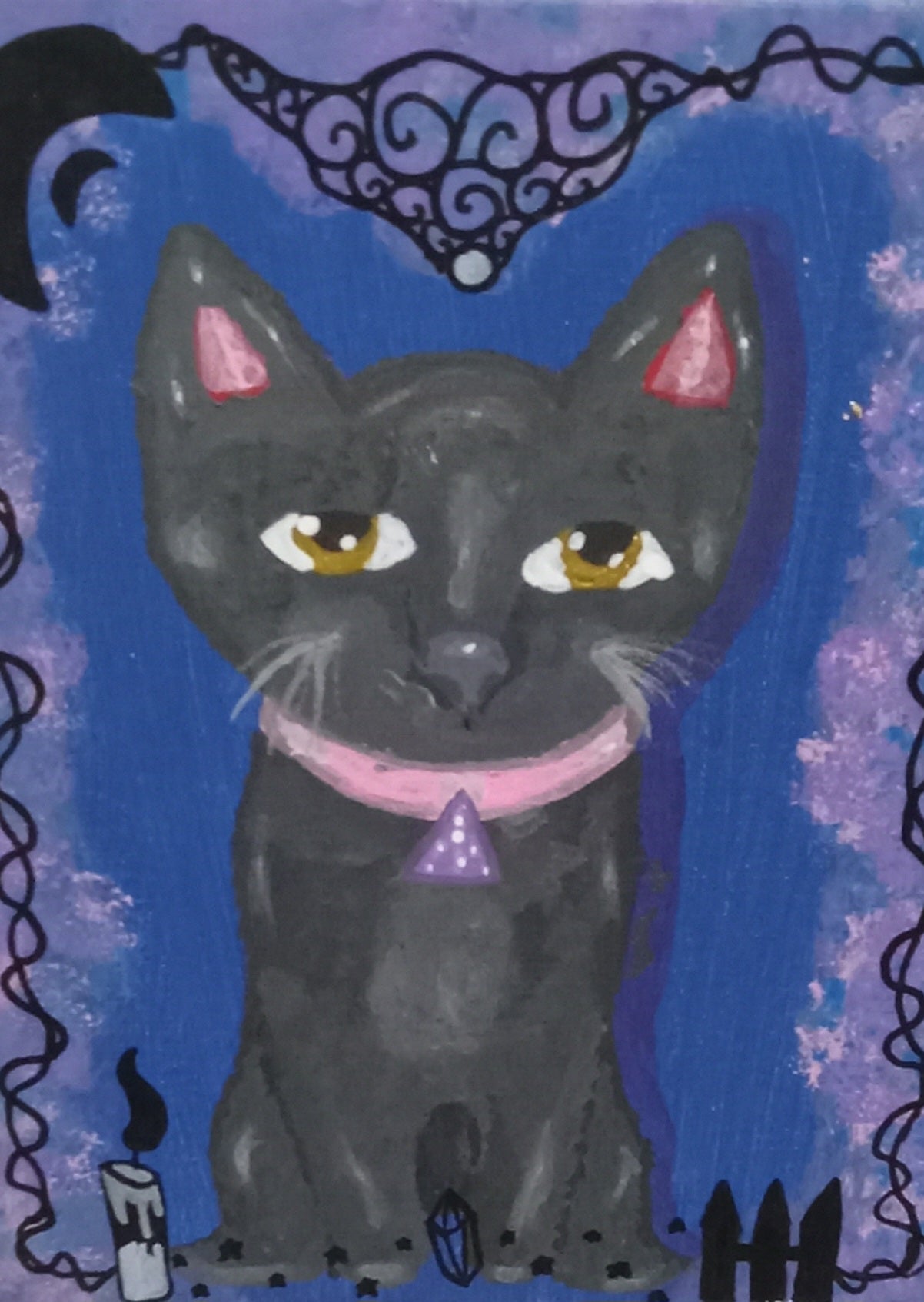 This painting is purrfect for any cat lover or witch enthusiast with its depiction of an adorable black cat that would bring much joy to any space. The cool purple and blue colors highlighted throughout the painting give it a very calming sense and allow the cat's beautiful golden eyes to pop. The black creative border of the painting adds a perfect finishing touch, giving it a witchy feel.